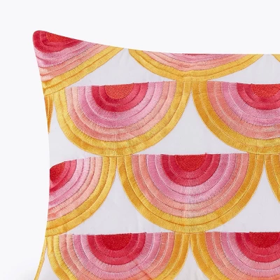 Shades of the sunset adorn a series of scallops on this embroidered pillow.
