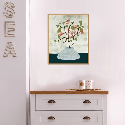 ART DESCRIPTION: In this modern and minimalist print, moss green leaves and red stamen on branches of brown are anchored by a sqat clay pot set atop a navy surface before a neutral gray background. This Amanti Art canvas art print was created by Melissa Wang and printed by Amanti Art in Madison WI. The canvas is stretched by hand and finished with a float frame. Individually made using traditional custom framing techniques, it has the quality you would expect from your local frame shop. Because of our attention to detail and focus on artistry, architects, interior designers, and homeowners alike choose this framed canvas artwork to create beautiful living spaces.