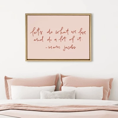 Inspire your day with this motivational quote from renowned designer Marc Jacobs. Framed in the USA in Waunakee, Wisconsin, this floating canvas art will be a pleasure to look at every day in your living room, home office, bedroom, nursery, or any room in the home. Printed on gallery-wrapped canvas and framed with a lightweight polystyrene frame, this wall art has two hangers already attached to the MDF back for easy wall display. The outer dimensions are 24 inches tall by 18 inches wide by 1.63 inches deep. Print Name: “Do What We Love”.