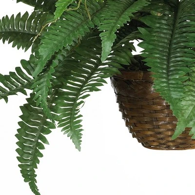 Travel back in time with this elegantly styled Boston fern silk hanging basket. Reminiscent of Victorian days, this native of the tropics has been a favorite throughout the years. A perfect complement to your front porch area, this leafy creation is covered from head to toe with lush natural looking fronds. The expertly crafted alternate leaf pattern adds further to its authentic appeal. Nestled snuggly in a wicker basket, this impressive plant will provide you with years of carefree pleasure.