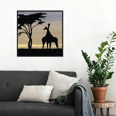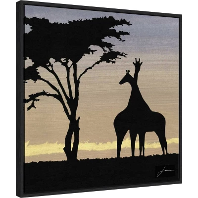 ART DESCRIPTION: An African scene is portrayed in this artwork with the beautiful lines of the giraffes silhouetted against the neutral sky. The acacia tree adds interest to the composition with the intertwined tree trunks mimicking the necks of the giraffes. This Amanti Art canvas art print was created by James Burghardt and printed by Amanti Art in Madison WI. The canvas is stretched by hand and finished with a float frame. Individually made using traditional custom framing techniques, it has the quality you would expect from your local frame shop. Because of our attention to detail and focus on artistry, architects, interior designers, and homeowners alike choose this framed canvas artwork to create beautiful living spaces.