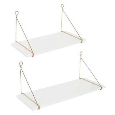 - Constructed with a reliably sturdy wooden material and finished with a hard, satin paint, these shelves were made not to chip or fade over time. The thick metal wire is a lovely brass color and is twisted around the shelf twice to add strength