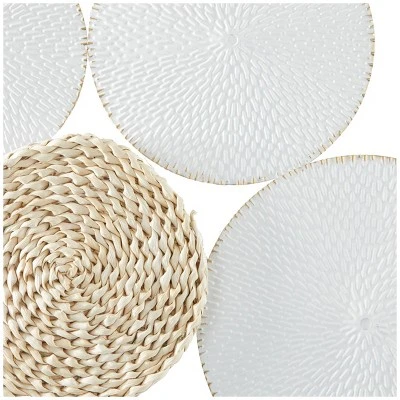 - Modern wall decoration showcases smooth white round metal decor with light brown coiled rope embellishments that suit most interior designs