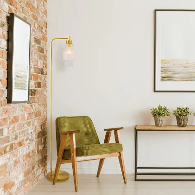 Make a standout addition to your modern or retro-style decor with the 63″ H Kyra Pillar Shade Floor Lamp from River of Goods. This floor lamp showcases a candlestick base made from brushed gold-finish metal and a clear glass pillar shade with a wider, textured center. It emits a soft, constant glow with one 40-watt E26 bulb (not included) and is also LED compatible — best of all, the 90-inch power cord with a foot switch allows for versatile placement and easy on/off.