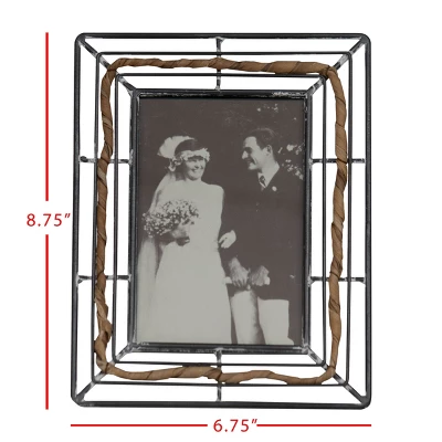 A 4×6 photo frame from Foreside Home & Garden that is the perfect accent to pair with your rustic home décor. Characterized by a mixing of materials, it is a charcoal metal wire frame with slight white distressing, accented by a natural fiber wrapping between layers of metal that soften the look. The glass front will help to protect your photo from dust and other damage. A great option to frame your favorite photo memory on your shelf, desk, side table, mantel, or hung on a wall for a versatile display anywhere in your home.