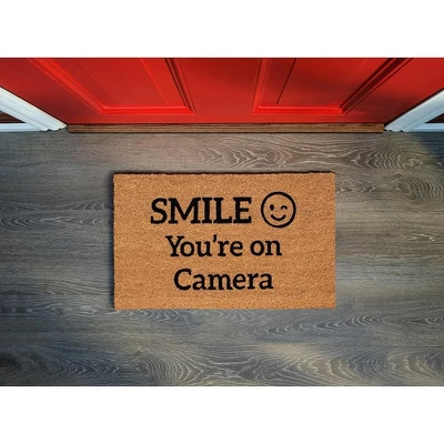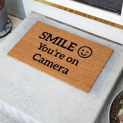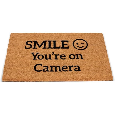 - FUNNY FRONT DOOR DECOR: The welcome mat provides a humorous yet protective message to your entryway, doorway, front door, front porch, or back door. The classic “Smile You’re On Camera” message informs visitors they are being watched while also being fun for family and friends