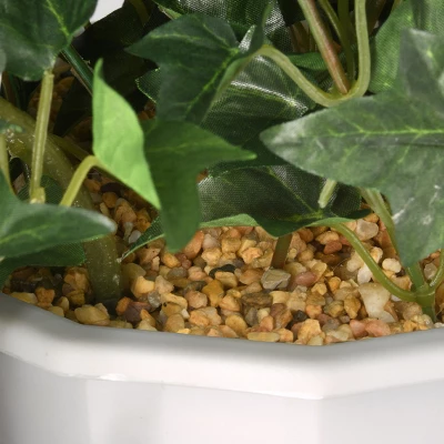 This hanging decoration features blue morning glory flower blooms that are flowing from long leafy vines. The plant is contained in a sturdy white molded plastic pot with straps and a hook. This artificial hanging plant appears to be living yet requires no maintenance, water, or sunlight. Hang this attractive artificial greenery in indoor or covered outdoor locations.