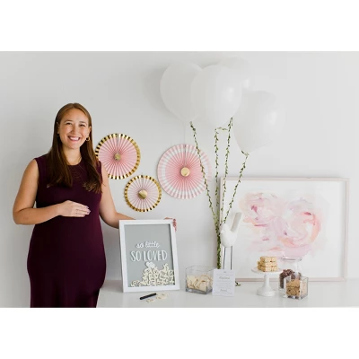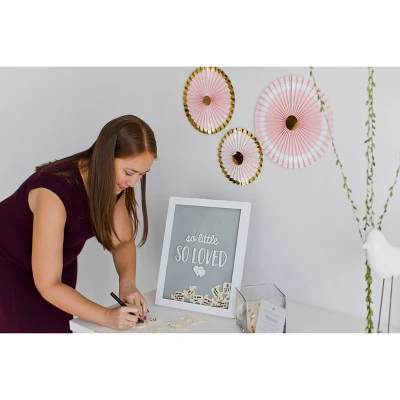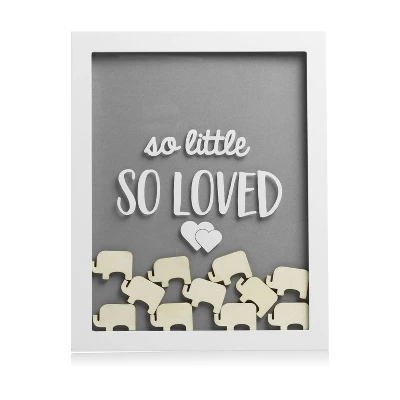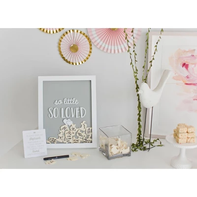 So little so loved! Pearheads little wishes signature frame is the perfect addition to your baby shower! Offer your quests a unique alternative to the traditional baby shower guest book with this frame. This adorable, wooden frame includes 65 wooden elephant pieces for all your guests to sign and drop in the frame. For your baby shower, simply prop up this frame next to the included instructional sign. Your guests can sign the elephant pieces with the included pen and drop into the top of the frame through the opening slot. Your guests will love writing in their advice, well wishes, and love for your little one! Once the baby shower is over, hang this adorable frame in your baby’s nursery with the included sawtooth hanger or place on their book shelf with the included easel. Years after your little one arrives, you will forever be able to cherish the well wishes and love from your closest family and friends. This modern white frame will add a fun decoration to your baby shower and baby’s nursery. The front of the frame includes “so little so loved” printed in white, adding that extra special touch. The colors and elephants make this the perfect frame for baby boys or baby girls. Forever cherish your little one with Pearhead’s little wishes signature frame.