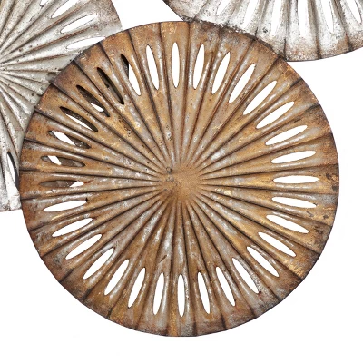 - •This wall decor features round metal plates with grooves and oval cutouts attached together