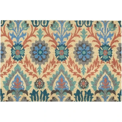 This Waverly Greetings doormat brings big personality to your home with its bold boho chic print. Its classic floral damask pattern is made modern through a palette of cool grey, green, yellow, and black hues. This contemporary doormat is machine made from durable coir fibers designed to trap dirt from being tracked into your home, making it ideal for your front door, entryway, or mudroom.