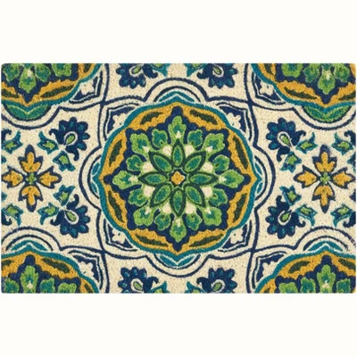 Get lost in the kaleidoscopic colors of this vibrant boho doormat from the Waverly Greetings collection. Floral mandalas in multi-toned blue, green, and yellow create a mesmerizing effect by your front door, entryway, or in your mud room. Machine made from durable coir, this modern doormat performs double duty as a guard against dirt; simply wipe your shoes before entering.
