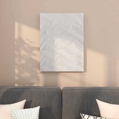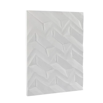 - Large white wooden wall art features a 2D carving of geometric shapes in a frameless structure that creates a uniquely modern and a stunning texture in any space